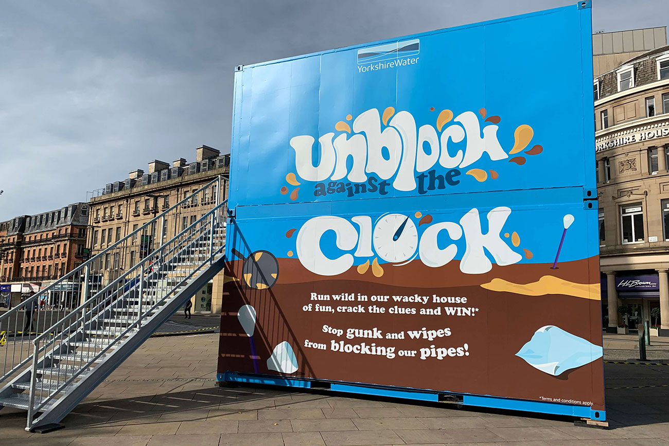 Created inside two stacked portable buildings, Unblock Against The Clock was installed in Yorkshire cities where there had been a particularly bad sewer blocking problem, like Huddersfield and Bradford.